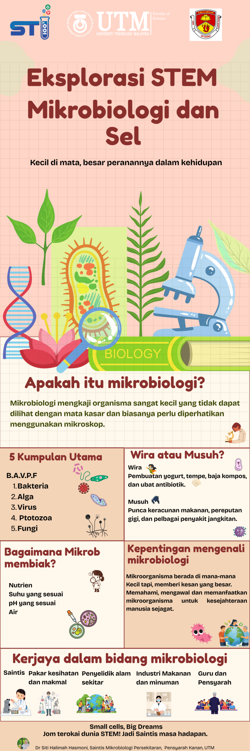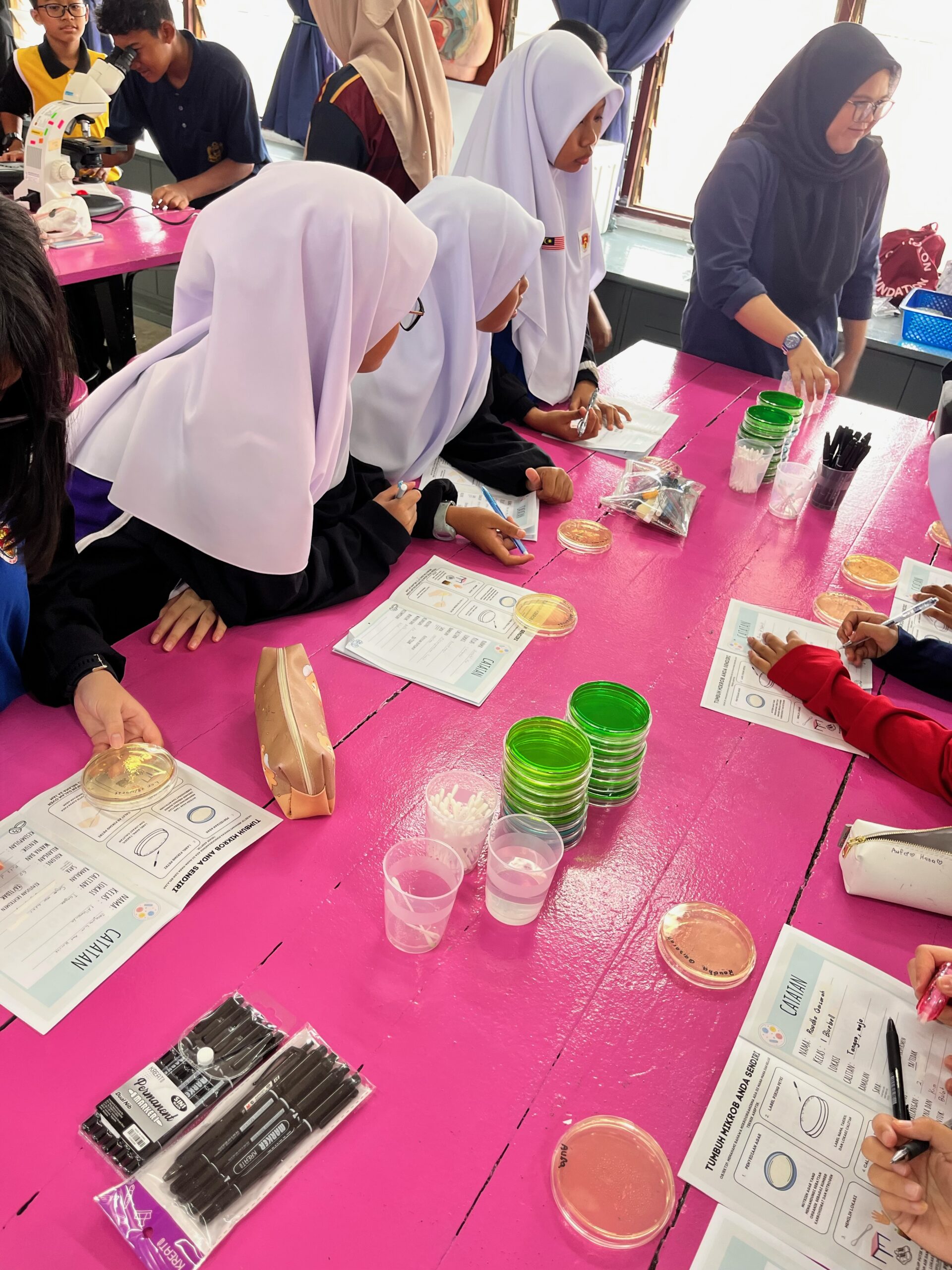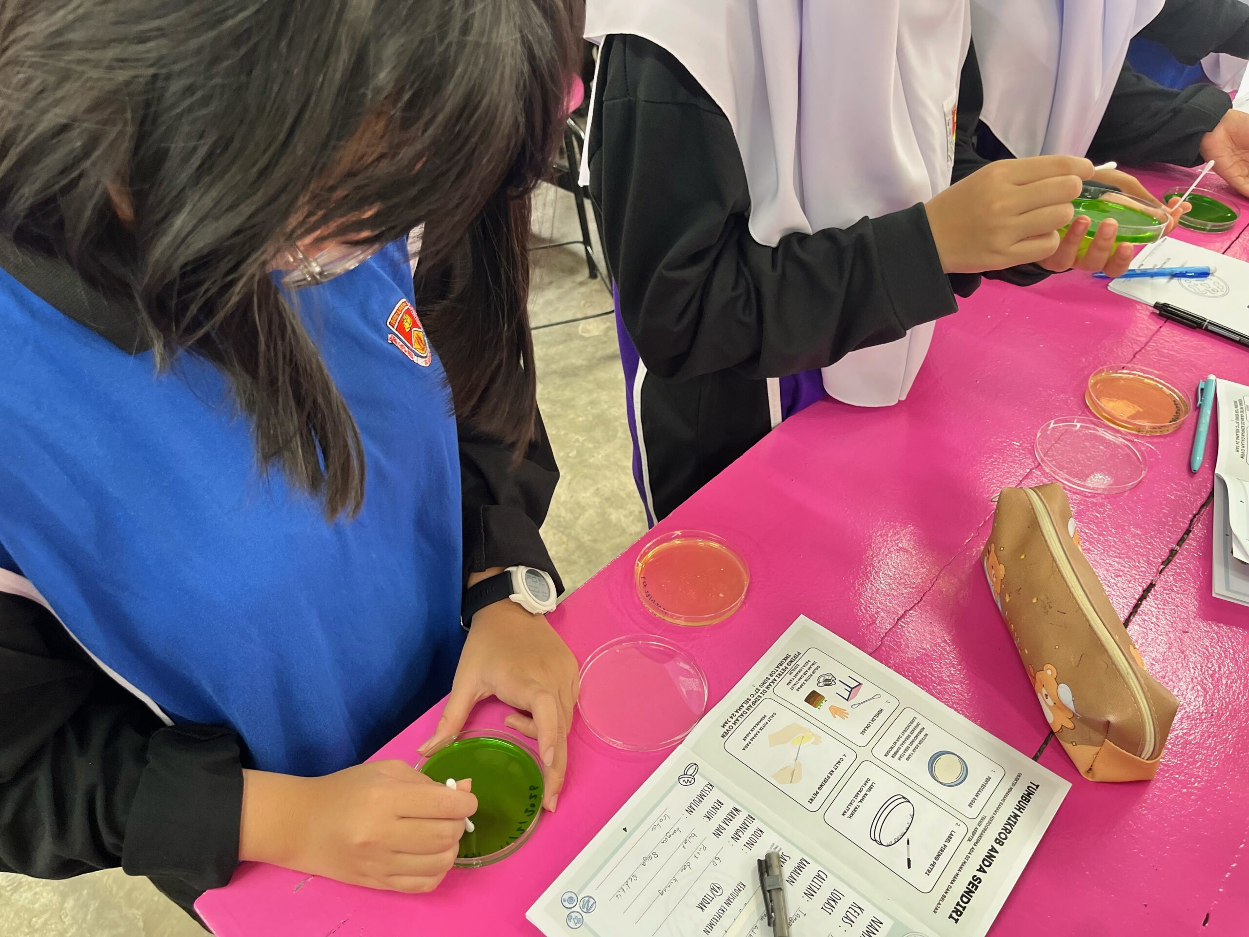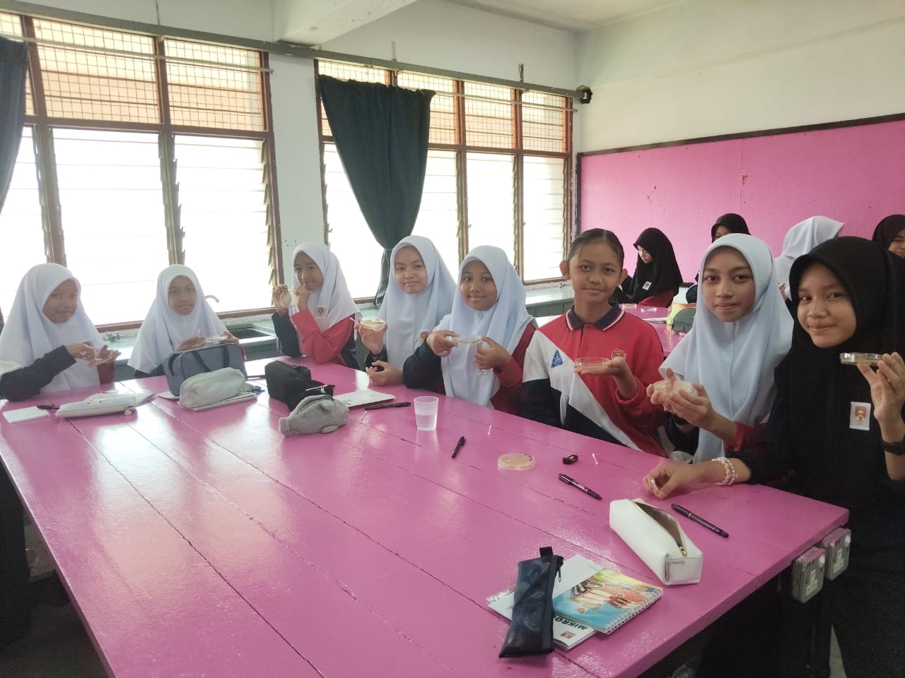 Led by Dr. Siti Halimah Hasmoni, with Puan Suhaidah Suleiman, Puan Farah Wahida Zaimuddin and nine undergraduate student of BSc Biology and BSc Industrial Biology, the programme was designed to provide foundational knowledge of microorganisms and their roles in everyday life. The initiative emphasised both awareness and appreciation of microbiology, highlighting its importance in health, environment, and biotechnology.