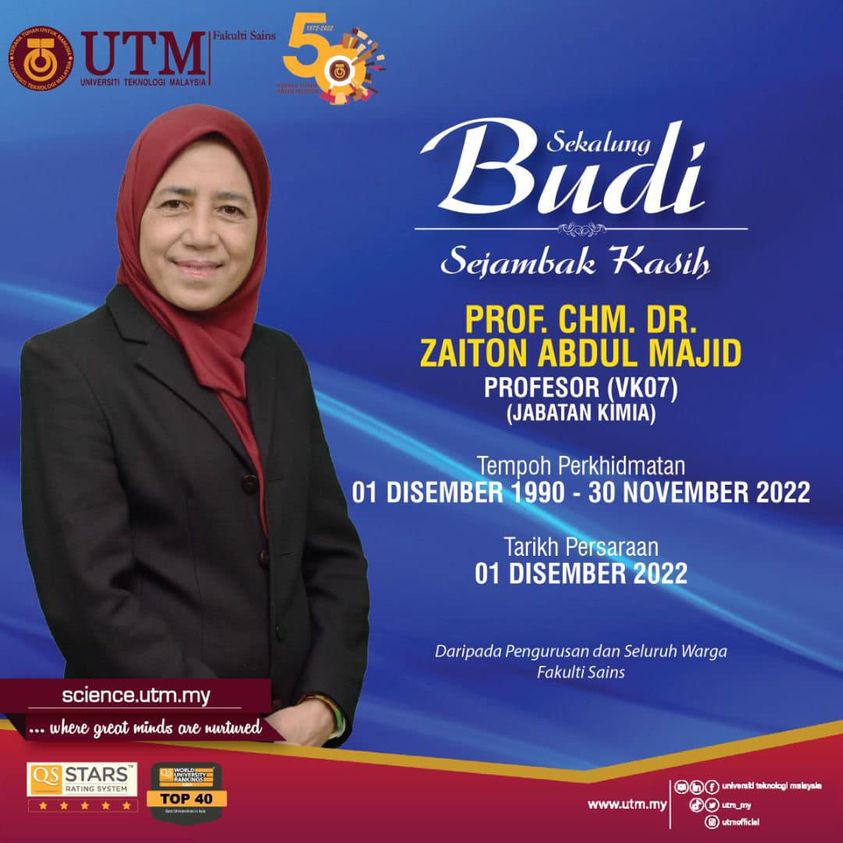 Sekalung Budi Dan Sejambak Kasih Kepada Prof. ChM. Dr. Zaiton Abdul Majid (Professor (VK07) Dec 3, 2022 | 2022 The Faculty would like to show our warmest appreciation to Prof. ChM. Dr. Zaiton Abdul Majid (Professor (VK07) – Department of Chemistry), for almost 32 years of hard work and dedication. We wish Prof. Zaiton a long and enjoyable retirement!