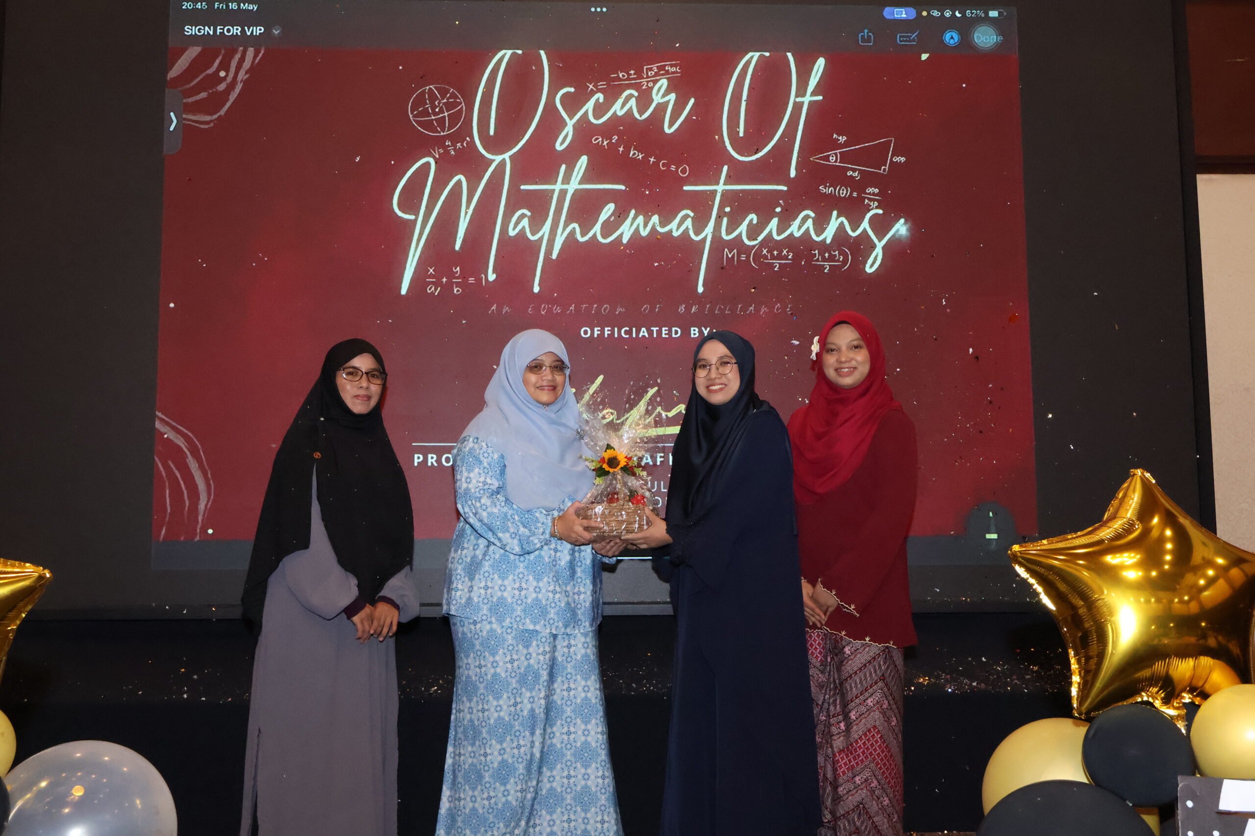 JOHOR BAHRU, 16 Mei 2025 – Program Oscar of Mathematicians 2025 anjuran Jabatan Sains Matematik, Fakulti Sains, Universiti Teknologi Malaysia (UTM) telah berlangsung dengan penuh meriah di Dewan Inderaputera, Pulai Spring Resort. Program ini diadakan bagi meraikan pelajar tahun akhir program SSCEH dan SSCMH yang bakal menamatkan pengajian, di samping menghargai pencapaian akademik serta sumbangan mereka sepanjang bergelar warga Fakulti Sains.