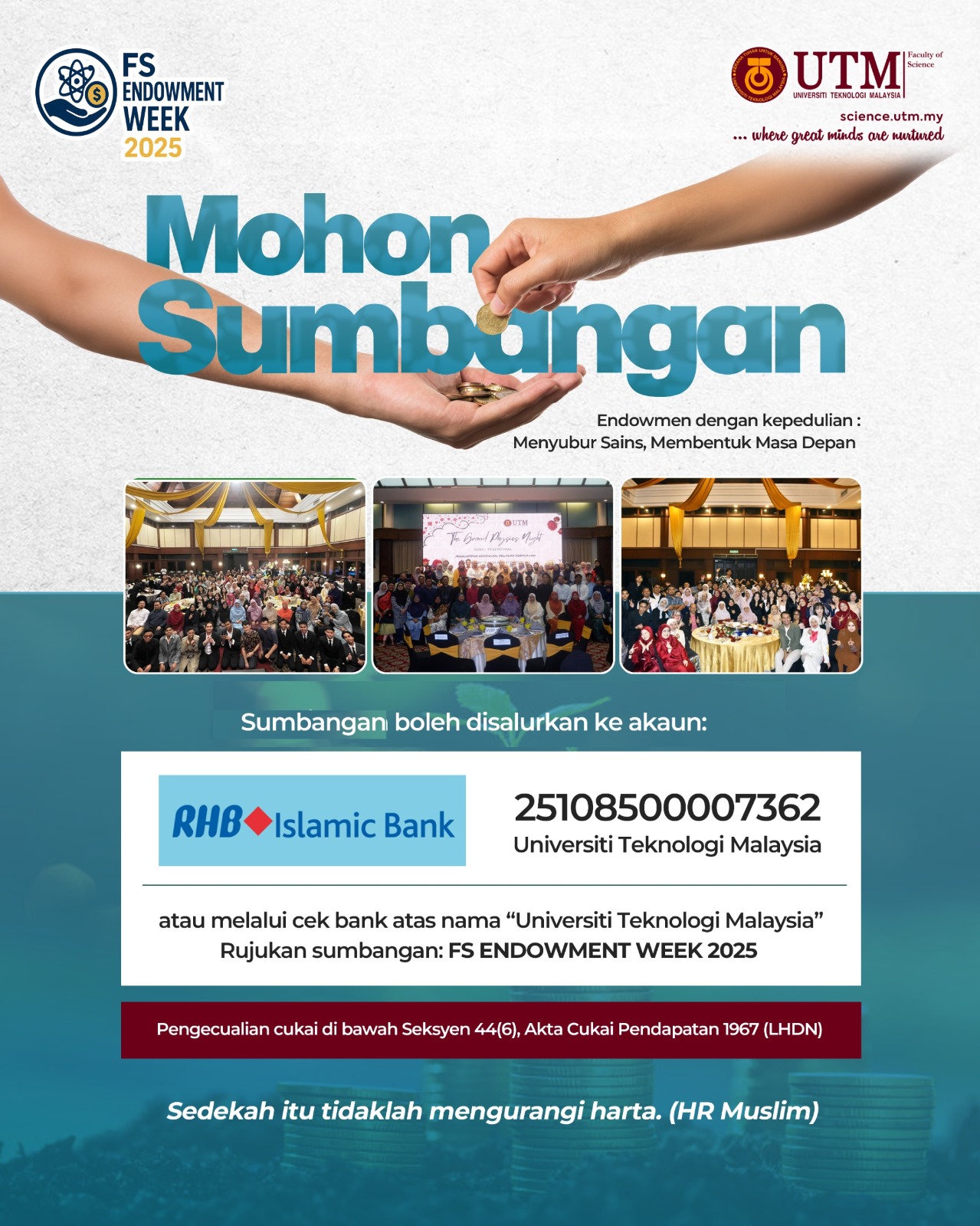 Fakulti Sains, Universiti Teknologi Malaysia (UTM) menyeru seluruh warga kampus, alumni, dan masyarakat untuk bersama-sama menjayakan FS Endowment Week 2025 β satu inisiatif berterusan untuk memupuk semangat kepedulian sosial serta memperkukuh dana endowmen fakulti.
