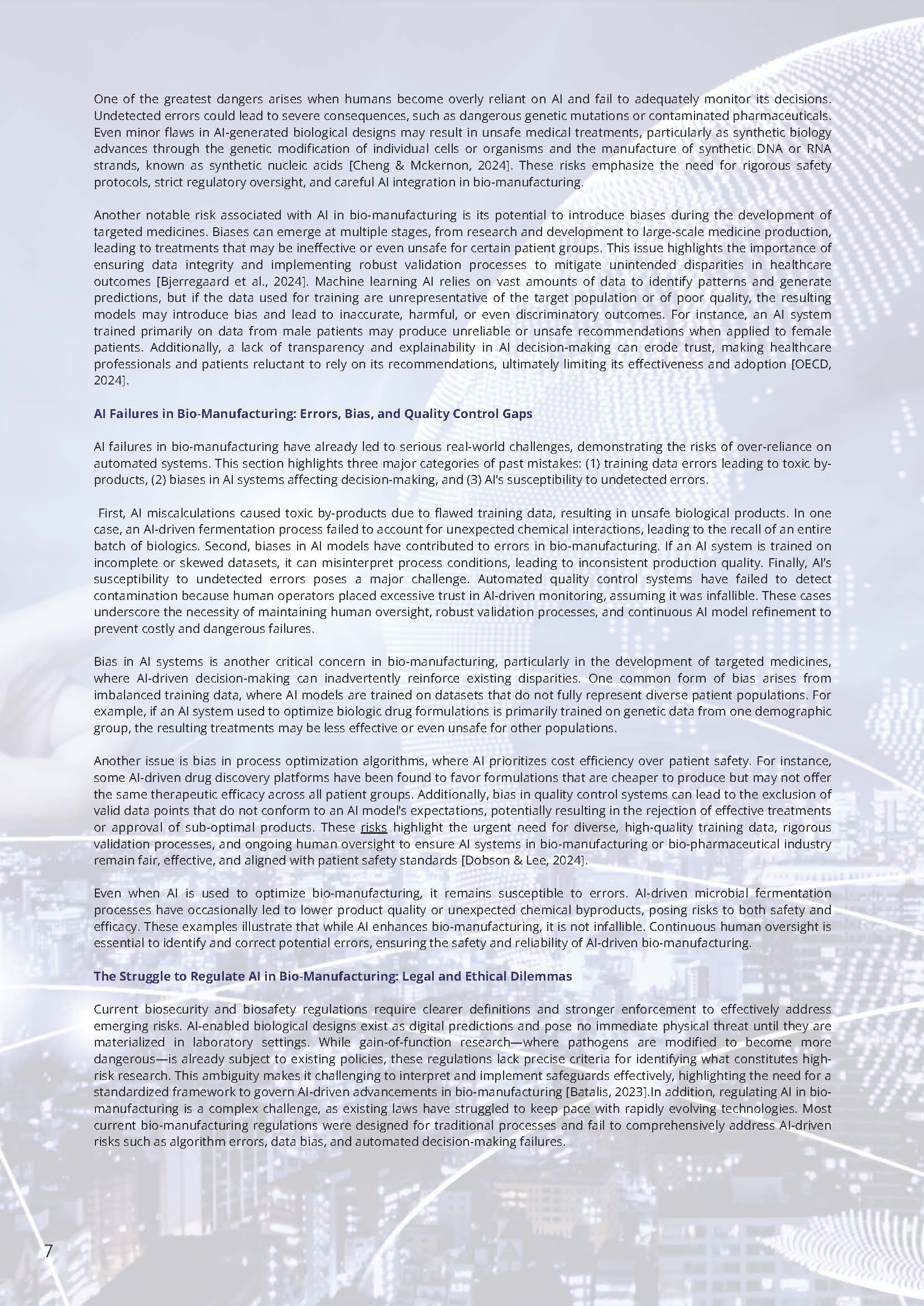One of the greatest dangers arises when humans become overly reliant on AI and fail to adequately monitor its decisions. Undetected errors could lead to severe consequences, such as dangerous genetic mutations or contaminated pharmaceuticals. Even minor flaws in AI-generated biological designs may result in unsafe medical treatments, particularly as synthetic biology advances through the genetic modification of individual cells or organisms and the manufacture of synthetic DNA or RNA strands, known as synthetic nucleic acids (Cheng & McKernon, 2024). These risks emphasize the need for rigorous safety protocols, strict regulatory oversight, and careful AI integration in bio-manufacturing.