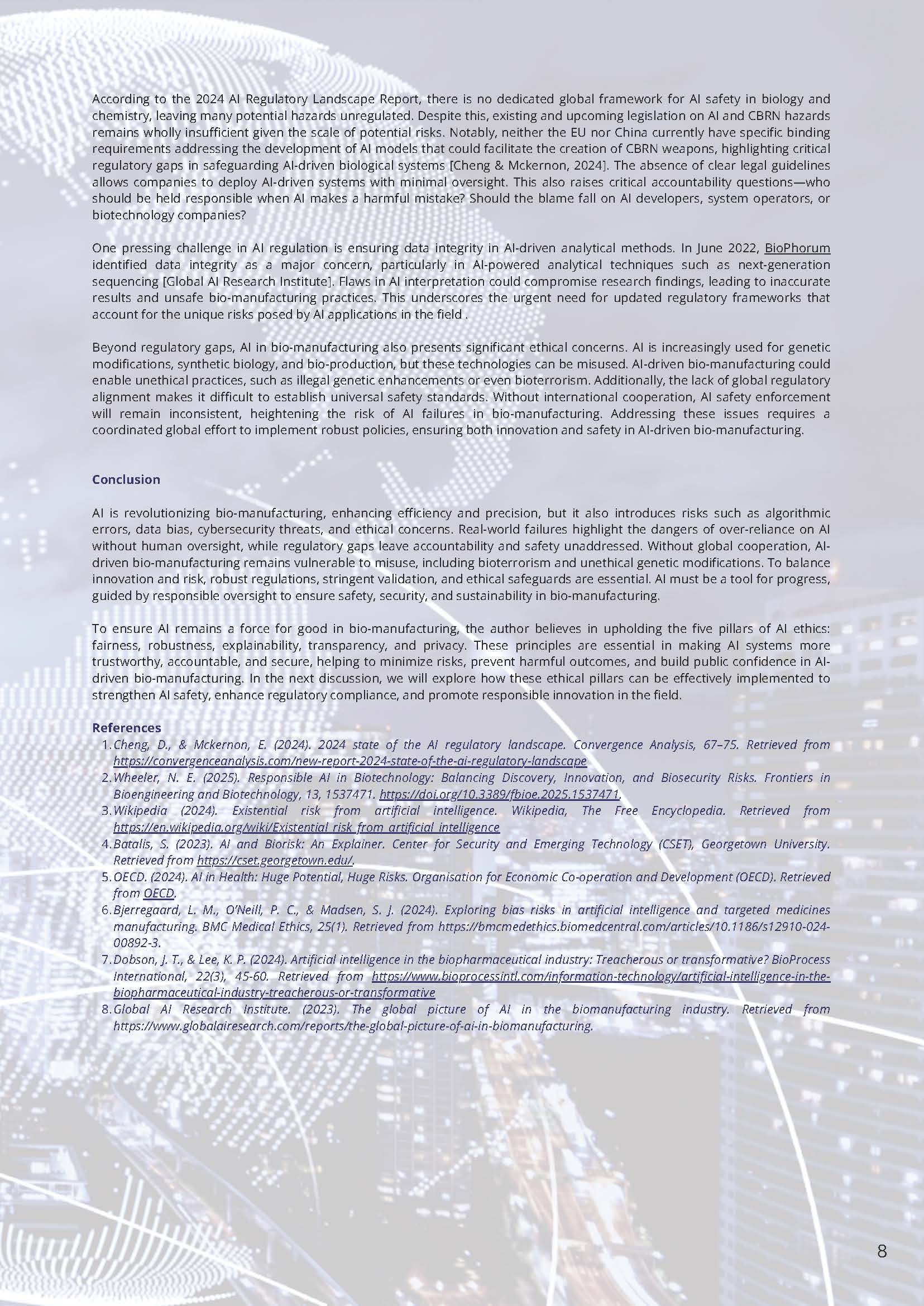 The increased reliance on AI in bio-manufacturing introduces critical risks that threaten safety, product quality, and security. While AI systems revolutionize processes through enhanced speed and precision, their growing autonomy creates vulnerabilities that may not be fully understood. The 2024 AI Regulatory Landscape Report emphasizes that AI-powered biotechnology systems require stringent oversight to prevent catastrophic failures, particularly when handling hazardous materials, as mitigating catastrophic risks from AI-enabled Chemical, Biological, Radiological, and Nuclear (CBRN) hazards has become a top global priority. The report highlights that CBRN hazards present one of the most immediate and severe risks posed by AI, as it is already capable of lowering the barriers to developing biological and chemical weapons—an issue expected to escalate in the near future (Cheng & McKernon, 2024).