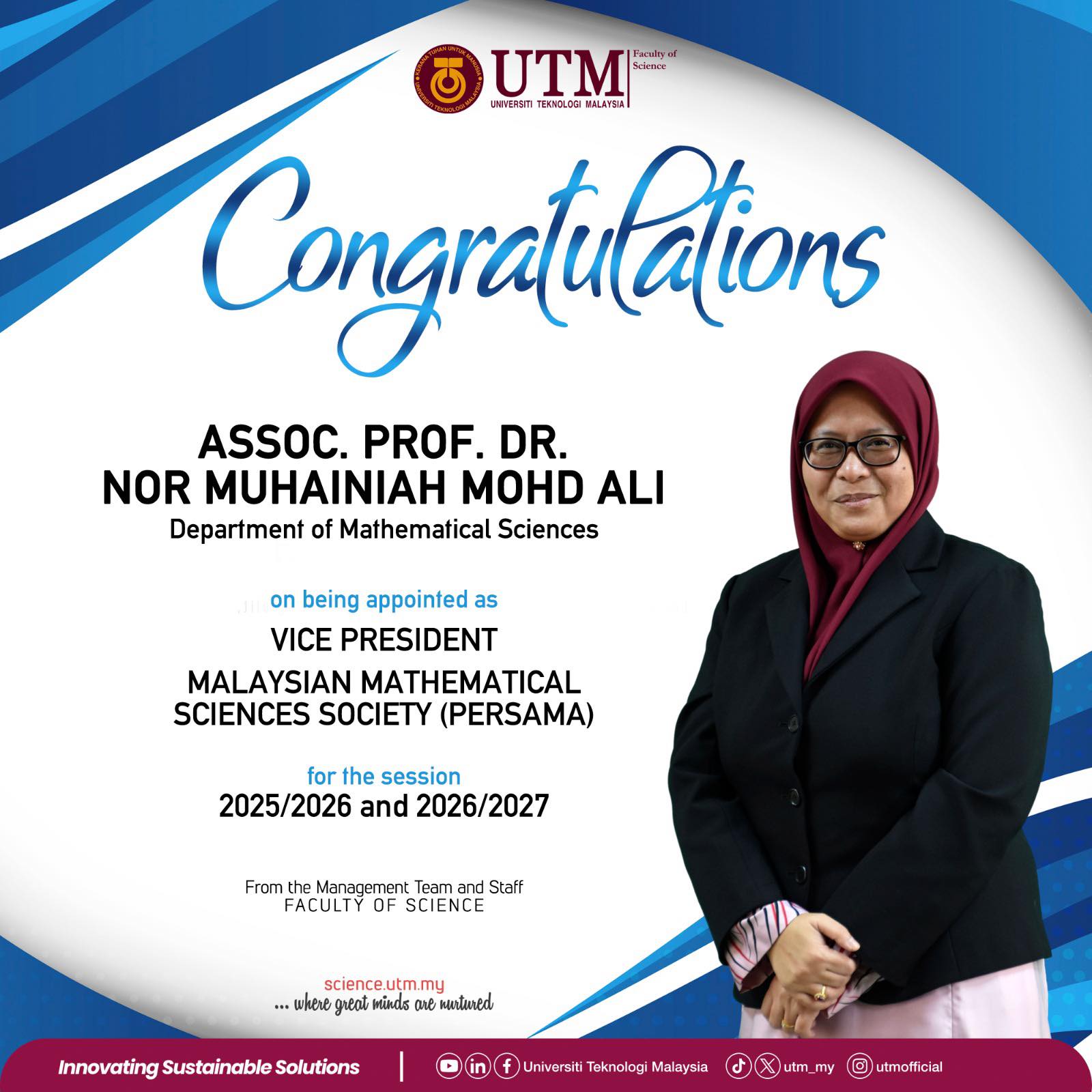 The Faculty of Science, Universiti Teknologi Malaysia (UTM), proudly congratulates Assoc. Prof. Dr. Nor Muhainiah Mohd Ali from the Department of Mathematical Sciences on her recent appointment as Vice President of the Malaysian Mathematical Sciences Society (PERSAMA) for the sessions 2025/2026 and 2026/2027.