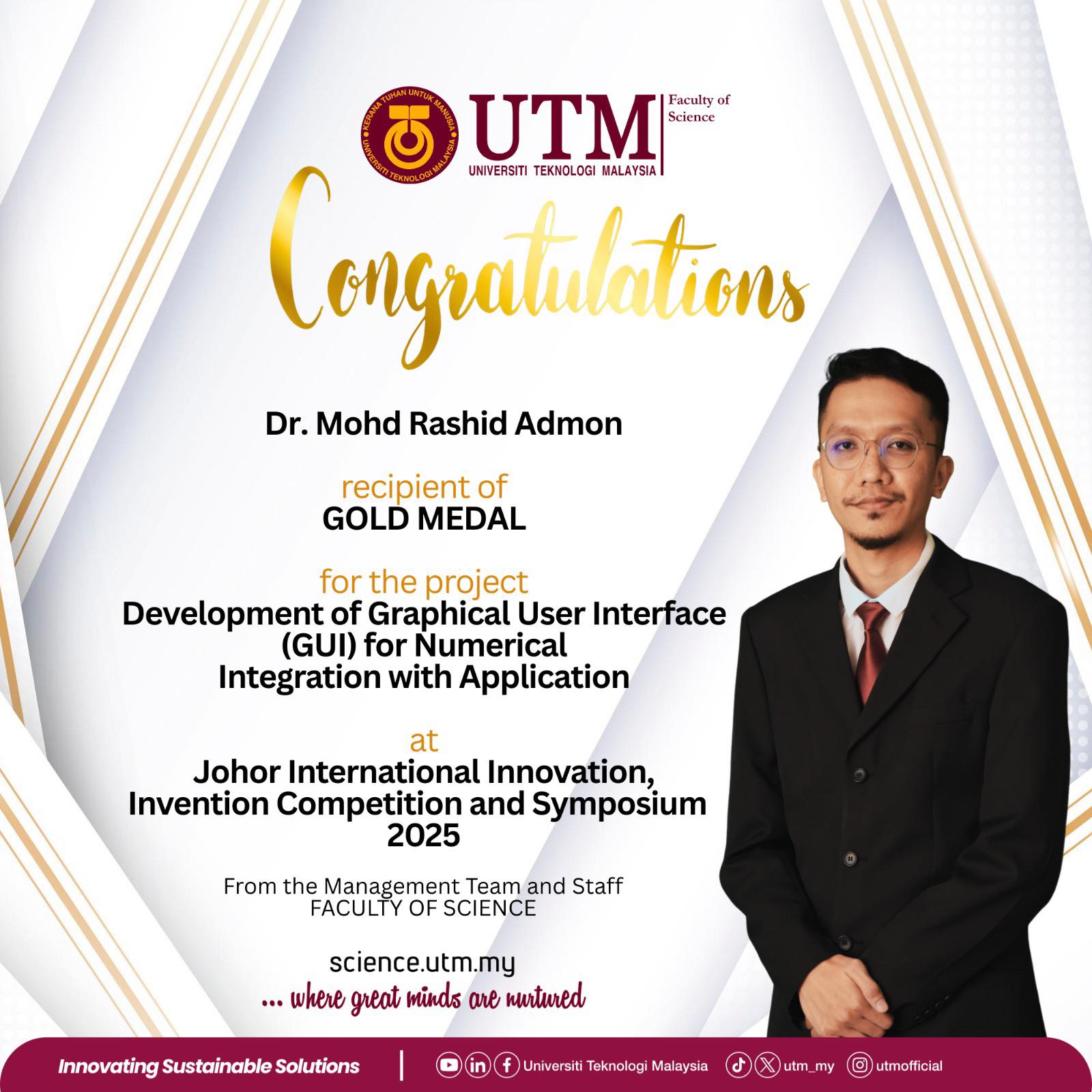 The Faculty of Science, Universiti Teknologi Malaysia (UTM), proudly congratulates Dr. Mohd Rashid Admon for winning the Gold Medal at the Johor International Innovation, Invention Competition and Symposium (JIIIS) 2025.