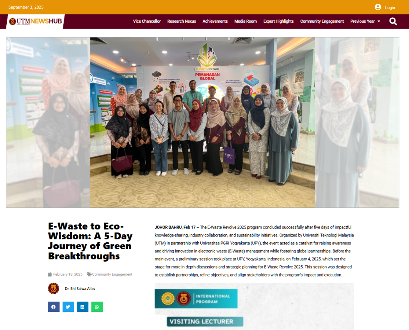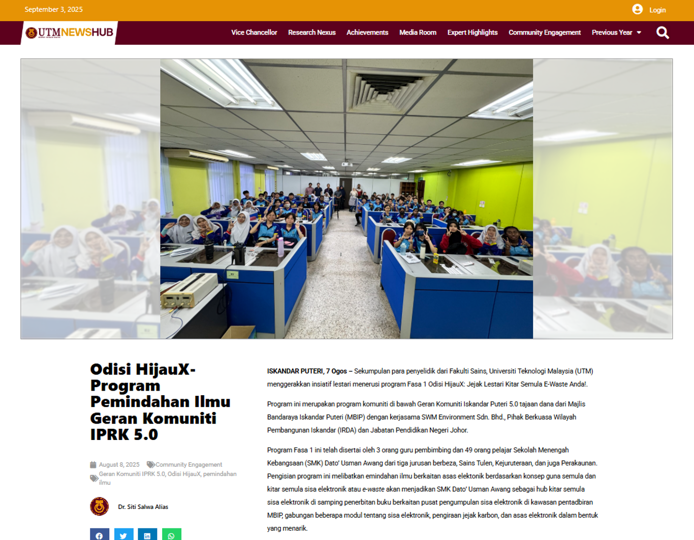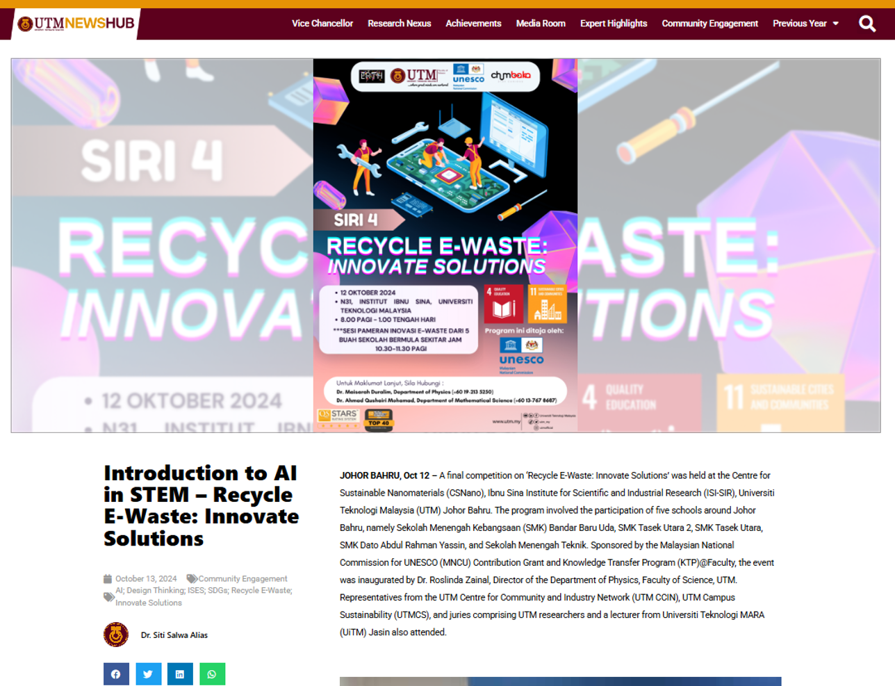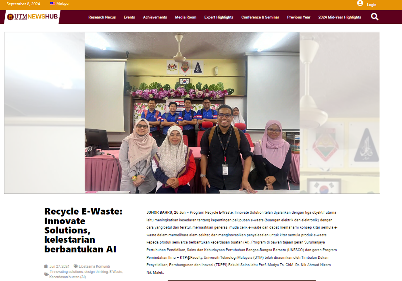 Universiti Teknologi Malaysia (UTM), through its Faculty of Science, continues to champion sustainability and environmental stewardship via the flagship project “E-Waste: Knowledge-Transfer via AI, Design Thinking Process, and Project-Based Learning.” Led by Dr. Siti Salwa Alias from the Department of Physics, this transformative initiative has successfully combined elements of technology, creativity, and education to address the growing challenge of electronic waste (e-waste) in Malaysia.