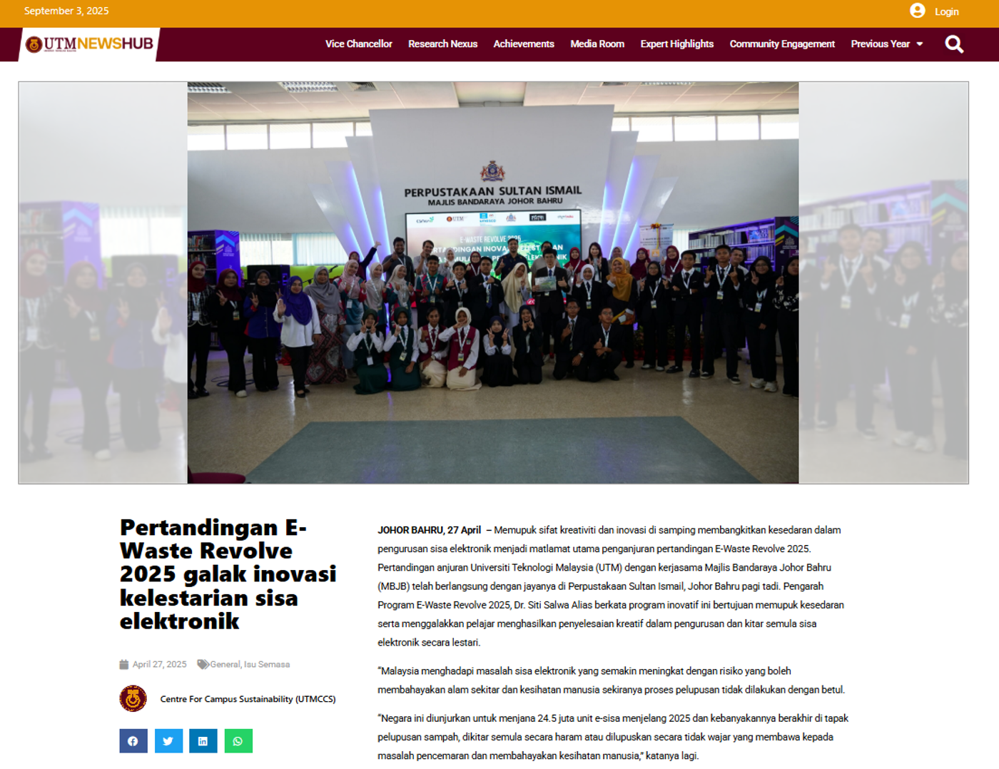 The program began with engagement sessions involving students from SMK Bandar Baru Uda, SMK Tasek Utara 2, SMK Tasek Utara, SMK Dato Abdul Rahman Yassin, and Sekolah Menengah Teknik Johor Bahru. These students participated in workshops and competitions under the theme “E-Waste: Small Devices, Big Impact,” resulting in the publication of copyrighted educational modules and a book titled Odysi Malar Hijau, which has been submitted to the Centre for Corporate and Industrial Networking (CCIN). The initiative was recognized with a 4-Star rating, affirming its quality and effectiveness.