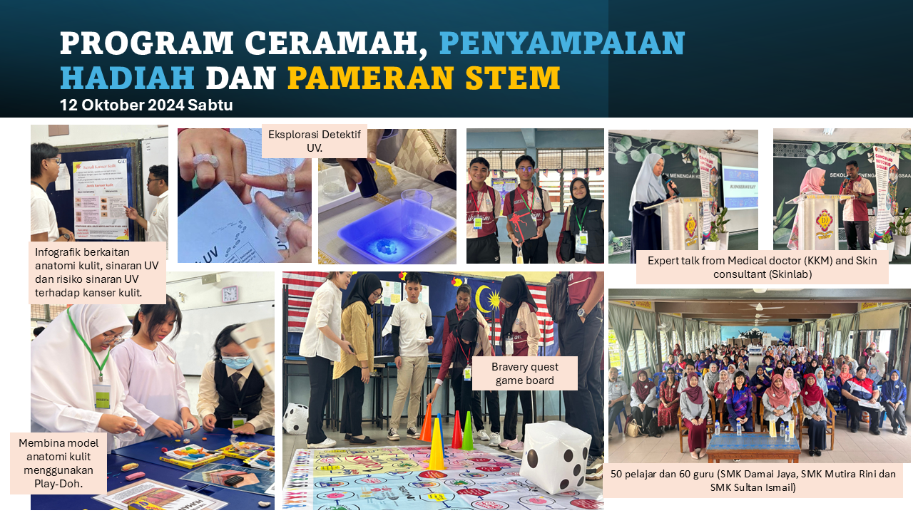 Skudai, Johor – 12 Oktober 2024 – Kumpulan Penyelidikan Cancer and Infectious Diseases (CAID) dari Universiti Teknologi Malaysia (UTM), menerusi inisiatif KTP@Fakulti, telah melaksanakan satu program komuniti berimpak tinggi bertujuan meningkatkan kesedaran tentang kanser kulit dan kesan sinaran UV. Program ini telah dilaksanakan dengan jayanya di SMK Damai Jaya, Johor dan melibatkan ceramah kesedaran, pertandingan video pendek, serta pameran interaktif STEM.