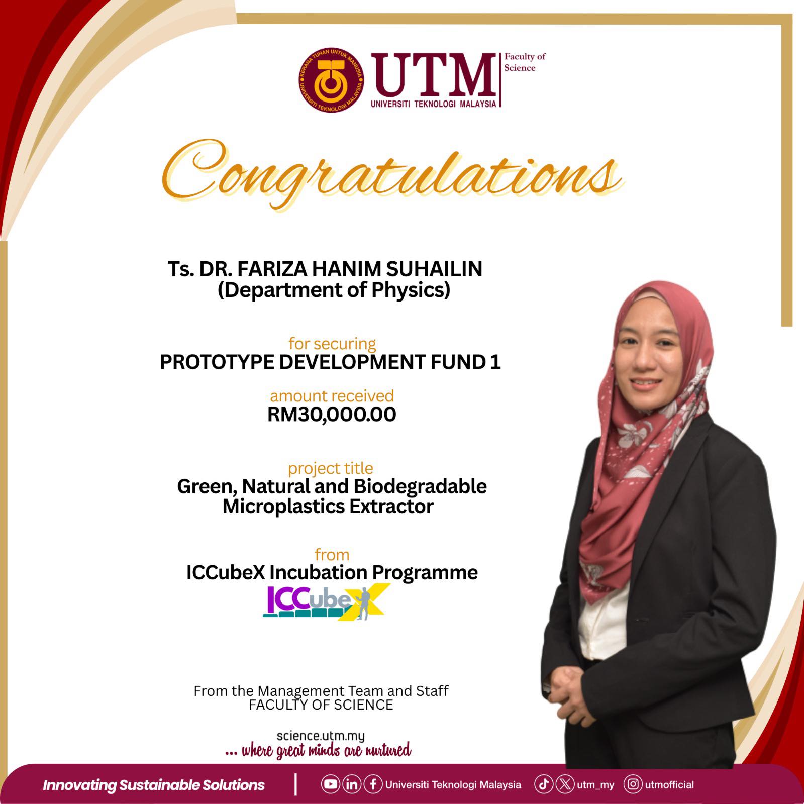 JOHOR BAHRU, 22 November 2025 — The Faculty of Science, Universiti Teknologi Malaysia (UTM), proudly congratulates Ts. Dr. Fariza Hanim Suhailin from the Department of Physics for successfully securing Prototype Development Fund 1 amounting to RM30,000 under the ICCubeX Incubation Programme.