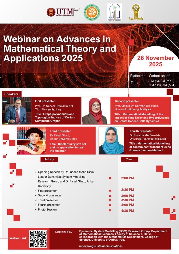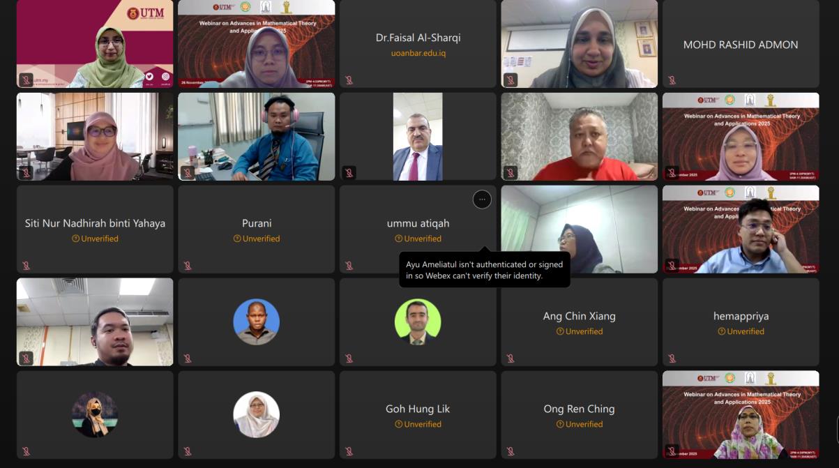 The Dynamical System Modelling (DSM) Research Group, Department of Mathematical Sciences, Faculty of Science, Universiti Teknologi Malaysia (UTM), successfully organised the Webinar on Advances in Mathematical Theory and Applications 2025 on 26 November 2025. Conducted via Webex with additional participation at Bilik Mesyuarat C22, the programme brought together researchers, academics, and postgraduate students from Malaysia and Iraq, showcasing UTM’s continued leadership in mathematical research and international collaboration.