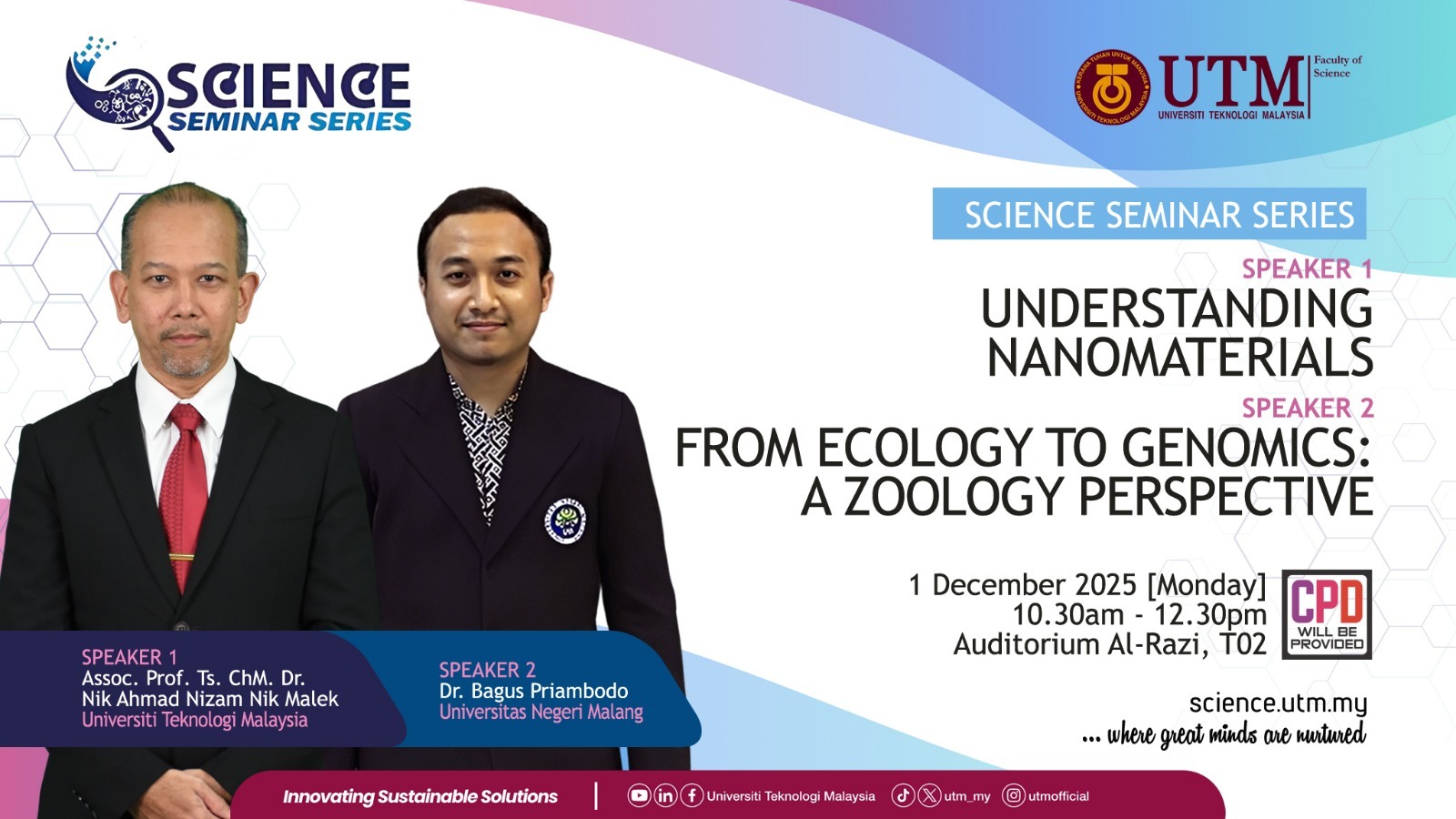 Johor Bahru, 1 December 2025 – The Faculty of Science, Universiti Teknologi Malaysia (UTM), successfully organised another instalment of the Science Seminar Series, bringing together academic experts to share insights on cutting-edge developments in nanomaterials and zoological genomics. The event took place from 10.30 am to 12.30 pm at Auditorium Al-Razi, T02, and was attended by lecturers, researchers, postgraduate students, and international guests.