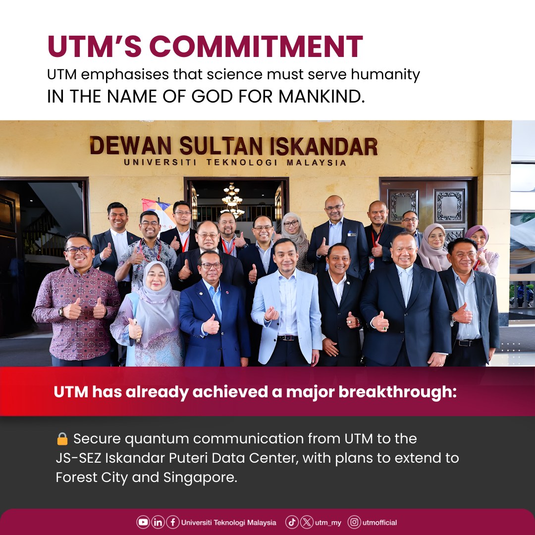 Prof. Shafry also announced a significant technological milestone achieved through collaboration involving UTM, Universiti Malaysia Perlis (UniMAP), TM, MIMOS, and ID Quantique, namely the successful implementation of secure quantum communication between UTM and the JS-SEZ Iskandar Puteri Data Centre. Plans are underway to extend this connectivity to the financial sector in Forest City and subsequently to Singapore.