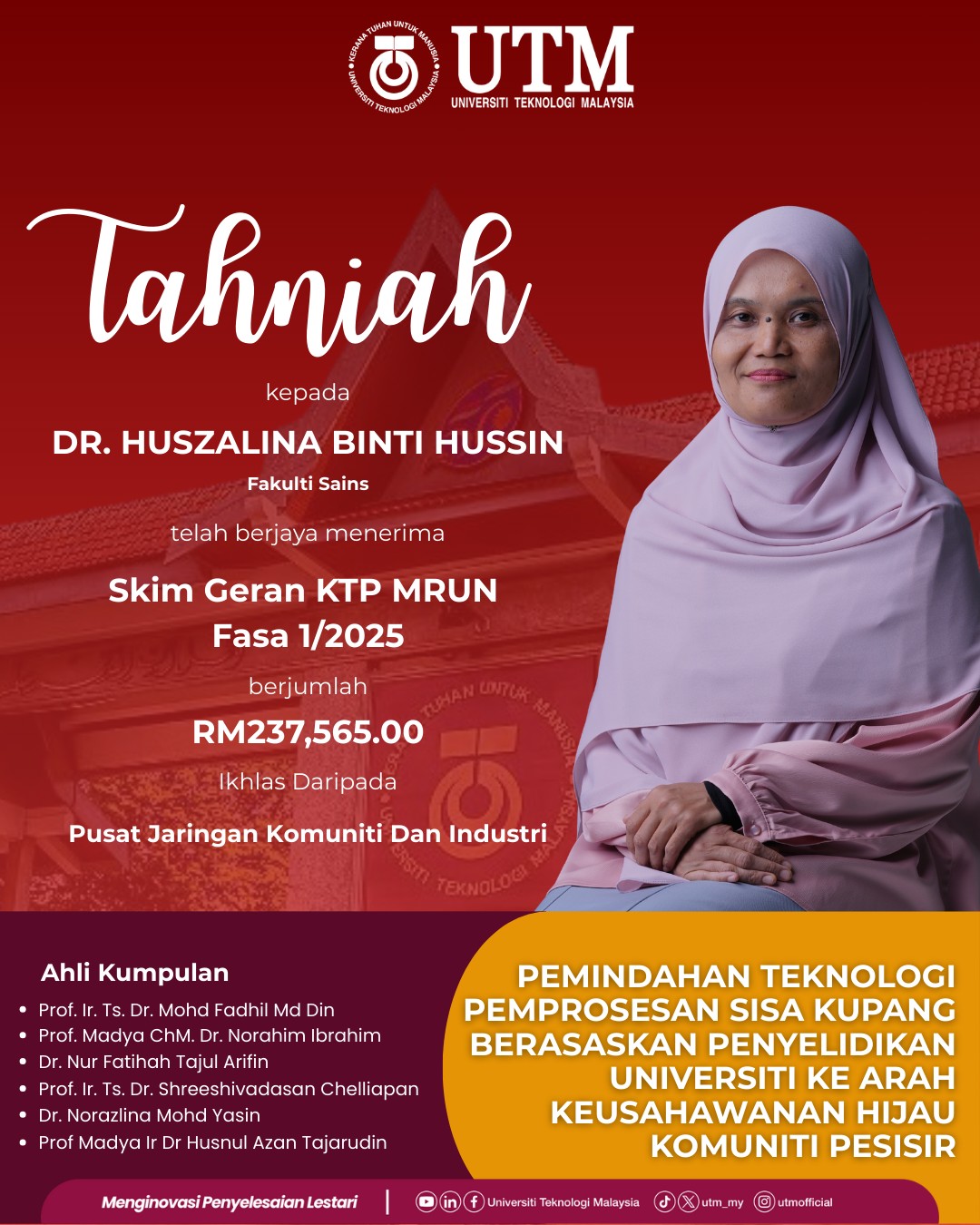 The Faculty of Science, UTM, congratulates the entire project team on this significant achievement and looks forward to the successful implementation and long-term impact of the initiative.