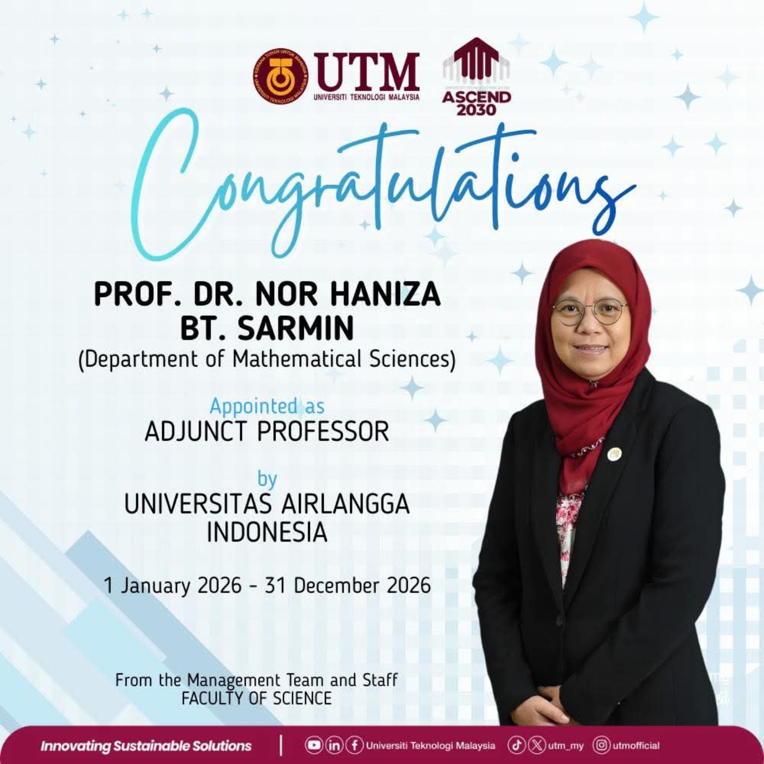 The Faculty of Science, Universiti Teknologi Malaysia (UTM), proudly congratulates Prof. Dr. Nor Haniza Bt. Sarmin from the Department of Mathematical Sciences on her appointment as an Adjunct Professor at Universitas Airlangga, Indonesia. The appointment is effective from 1 January 2026 until 31 December 2026.