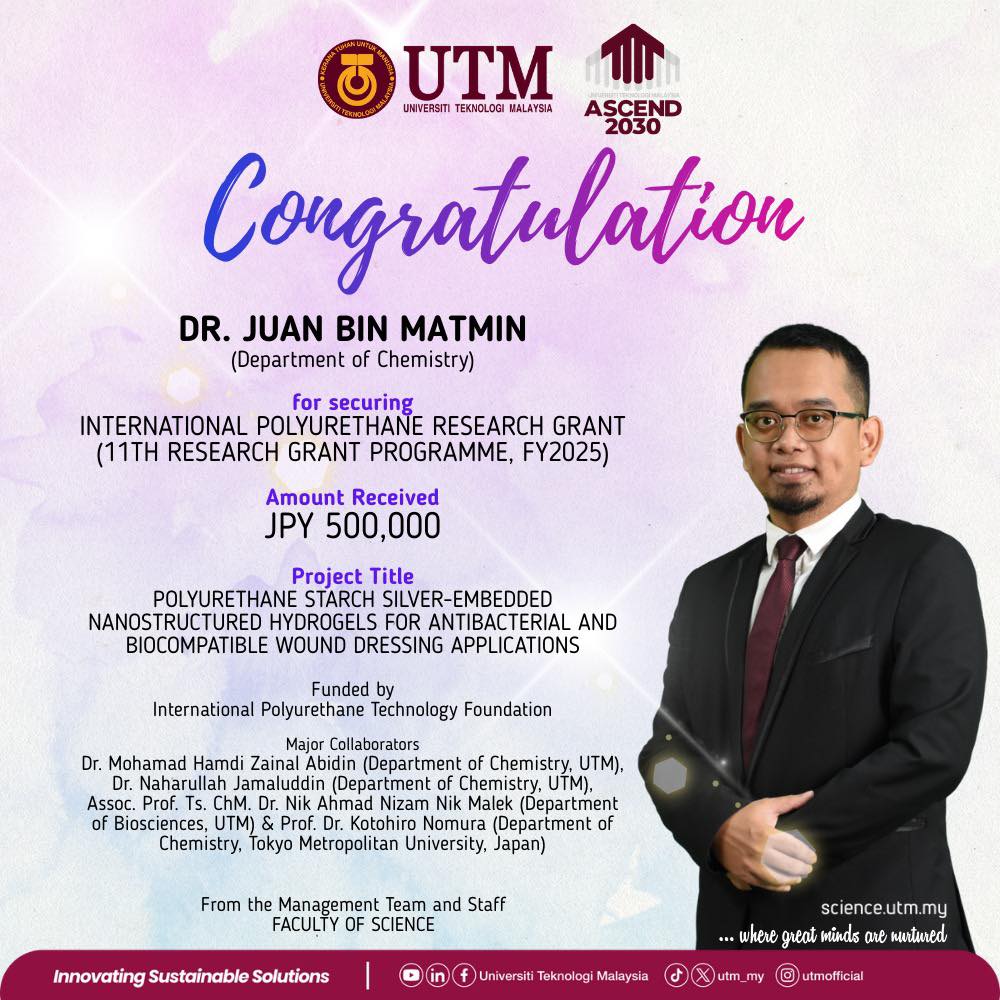 Johor Bahru, 12 February 2026 – The Faculty of Science, Universiti Teknologi Malaysia (UTM) proudly congratulates Dr. Juan Bin Matmin from the Department of Chemistry on successfully securing the International Polyurethane Research Grant (11th Research Grant Programme, FY2025).