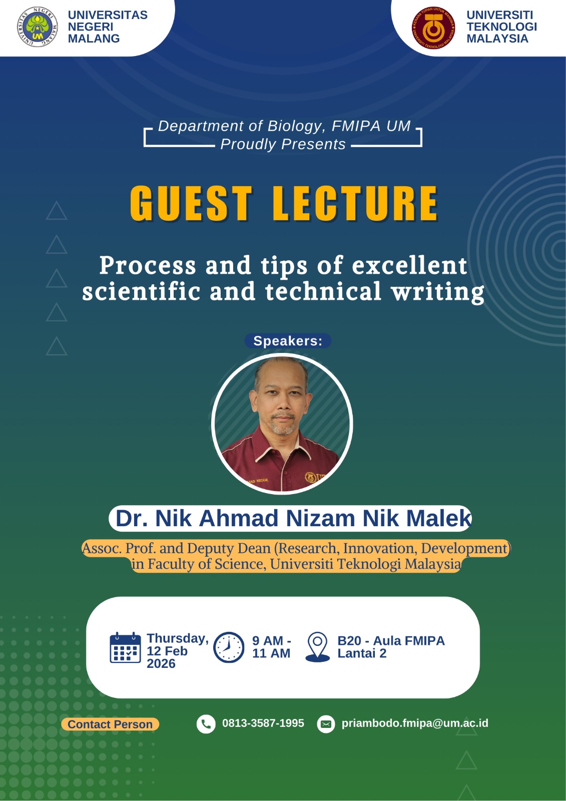 Malang, Indonesia, 12 February 2026 – The Department of Biology, FMIPA, Universitas Negeri Malang proudly hosted a Guest Lecture titled “Process and Tips of Excellent Scientific and Technical Writing” featuring Assoc. Prof. Ts. ChM. Dr. Nik Ahmad Nizam Nik Malek from Universiti Teknologi Malaysia.
