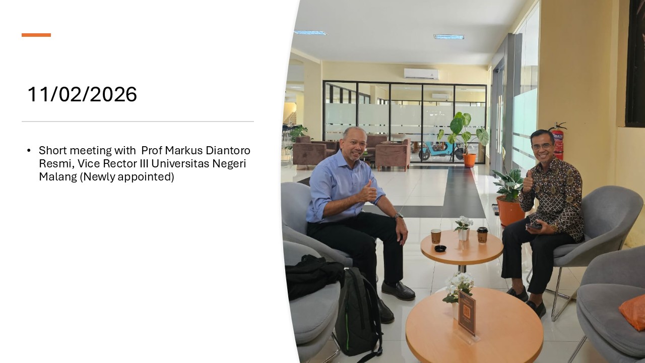 On 11 February 2026, the delegation held a short breakfast meeting with Prof. Markus Diantoro Resmi, Vice Rector III (newly appointed), Universitas Negeri Malang. A luncheon meeting was also organized with the FMIPA administrators, including: