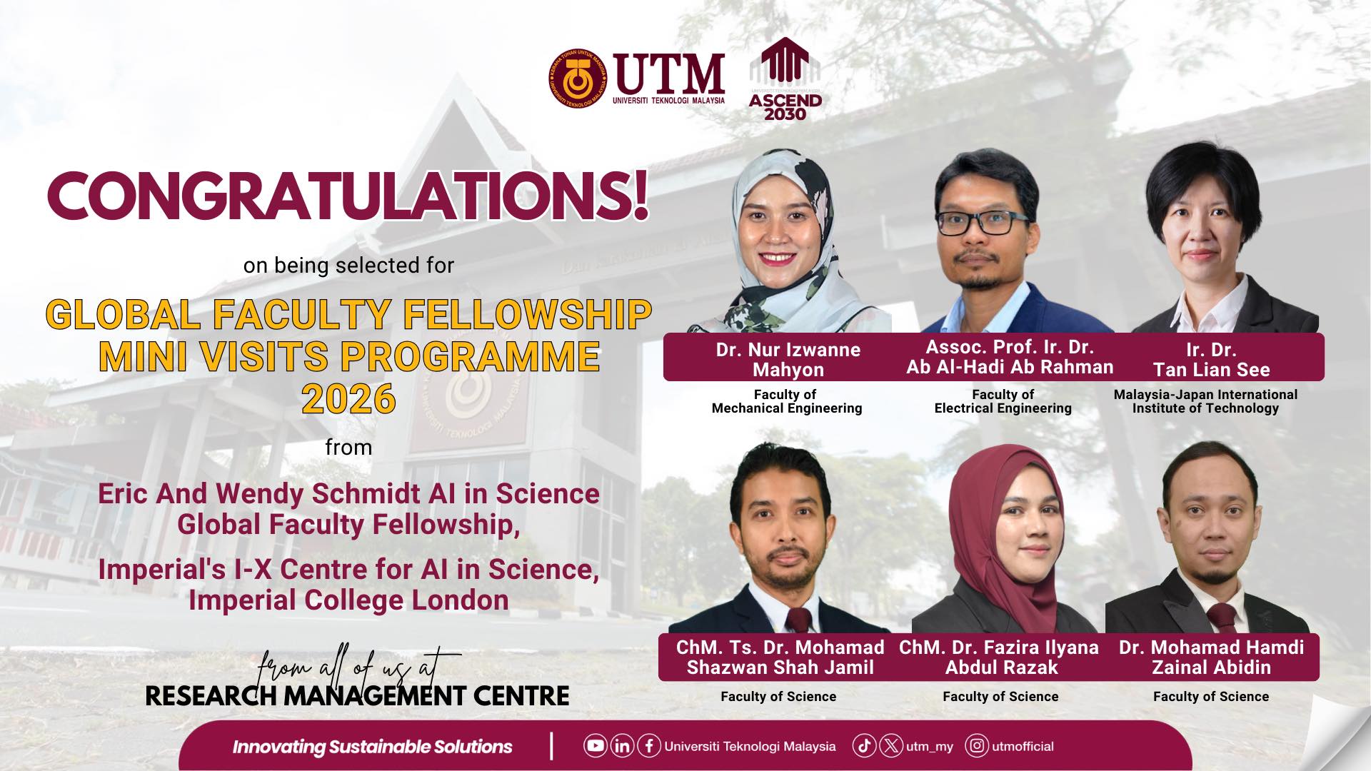Johor Bahru, 14 February 2026 – The Faculty of Science, Universiti Teknologi Malaysia (UTM), proudly congratulates three of its young and dynamic academics on being selected for the Global Faculty Fellowship Mini Visits Programme 2026 under the Eric and Wendy Schmidt AI in Science Global Faculty Fellowship, hosted by the I-X Centre for AI in Science, Imperial College London.