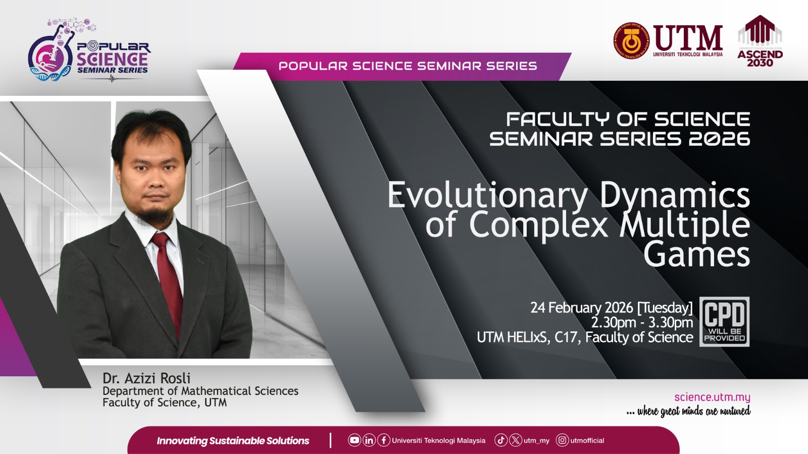 JOHOR BAHRU, 24 February 2026 – The Faculty of Science, Universiti Teknologi Malaysia (UTM), successfully organised a session of the Popular Science Seminar Series 2026 entitled “Evolutionary Dynamics of Complex Multiple Games”, presented by Dr. Azizi Rosli from the Department of Mathematical Sciences.