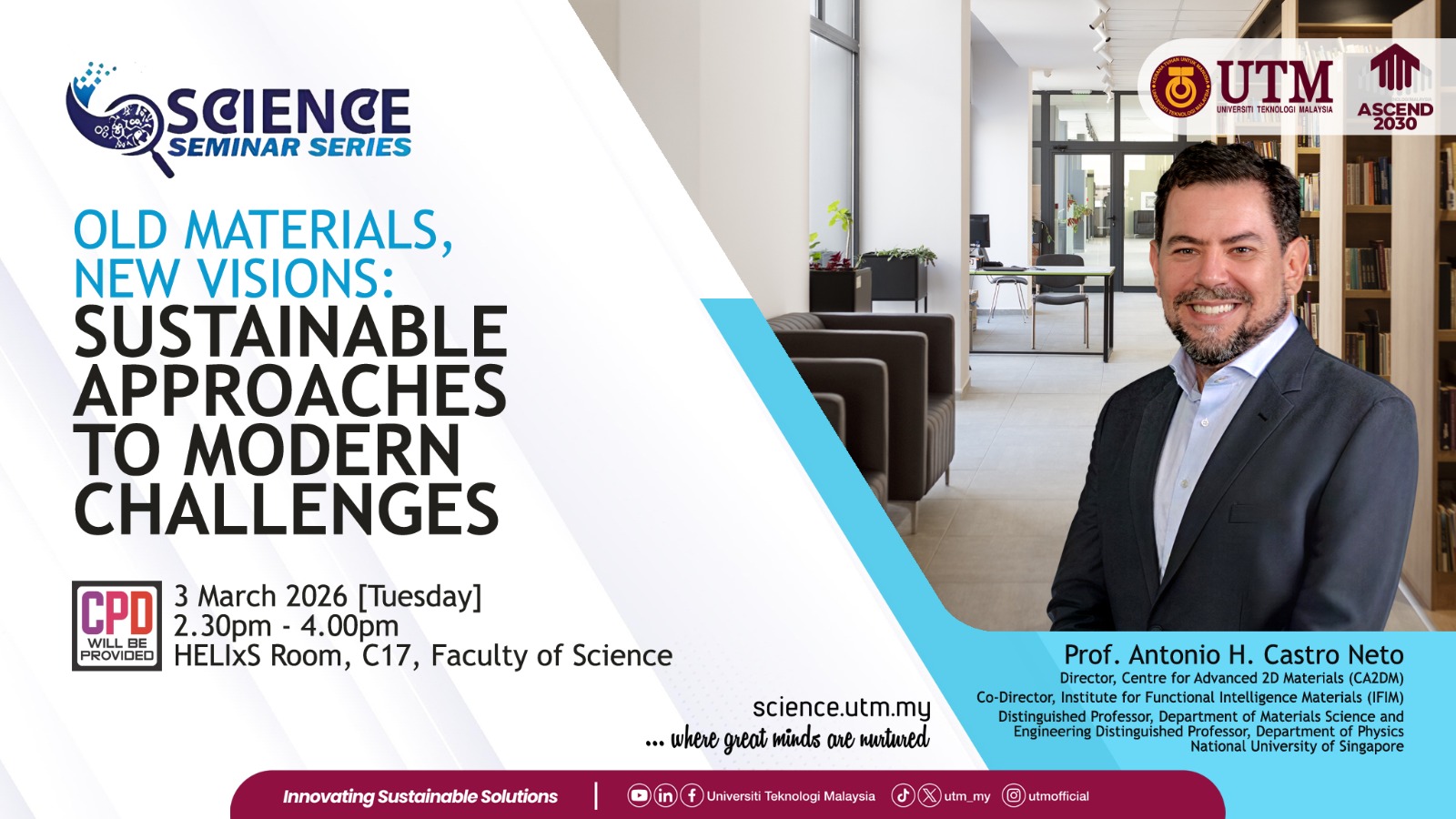 The Faculty of Science, Universiti Teknologi Malaysia (UTM), successfully organized a session of the Science Seminar Series featuring an internationally renowned materials physicist, Prof. Antonio Helio Castro Neto, on 3 March 2026 at the Auditorium Al Razi, T02, Faculty of Science, UTM. The seminar, titled “Old Materials, New Visions: Sustainable Approaches to Modern Challenges,” brought together academic staff, researchers, and students for an engaging knowledge-sharing session on emerging directions in sustainable materials science.