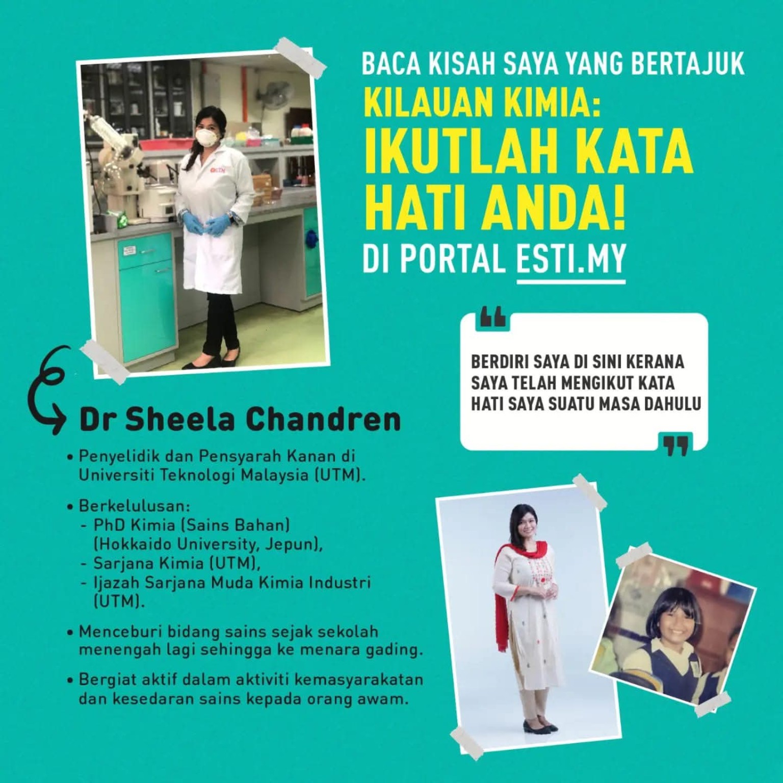 JOHOR BAHRU, 14 Mac 2026 – Kisah perjalanan akademik dan kerjaya dalam bidang sains sering kali dipenuhi dengan cabaran, dedikasi, dan minat yang mendalam terhadap ilmu. Perkara ini jelas terpancar melalui kisah inspirasi Dr Sheela Chandren, seorang Penyelidik dan Pensyarah Kanan di Universiti Teknologi Malaysia (UTM) yang berkongsi pengalaman beliau melalui portal ESTI.my menerusi kisah bertajuk “Kilauan Kimia: Ikutilah Kata Hati Anda!”.