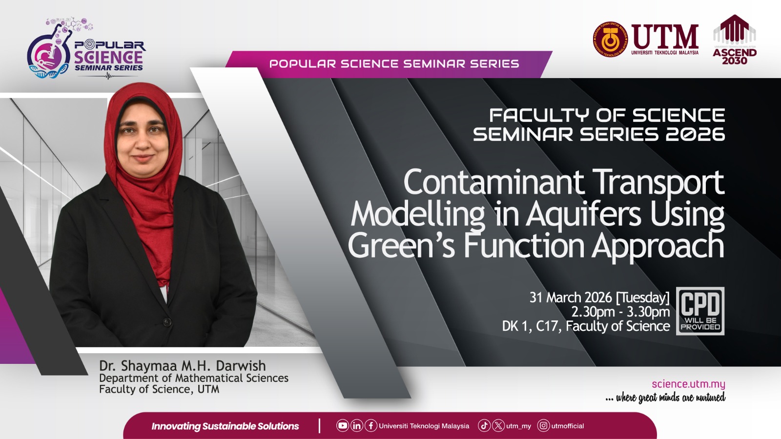 The seminar, titled “Contaminant Transport Modelling in Aquifers Using Green’s Function Approach”, was held on 31 March 2026 at DK 1, C17, Faculty of Science. The session attracted academic staff, researchers, and students interested in environmental modelling and applied mathematics.